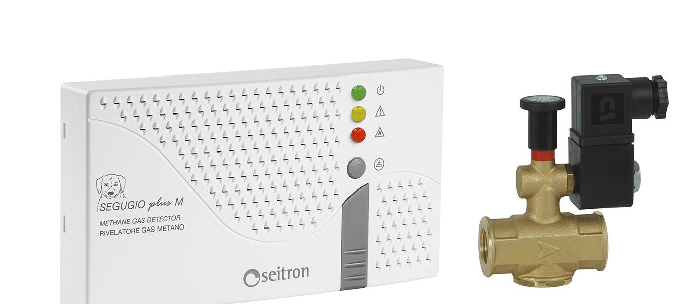 Kit including a Segugio methane gas detector with 230V~ power supply and shut-off valve. It is possible to choose among the following valves: